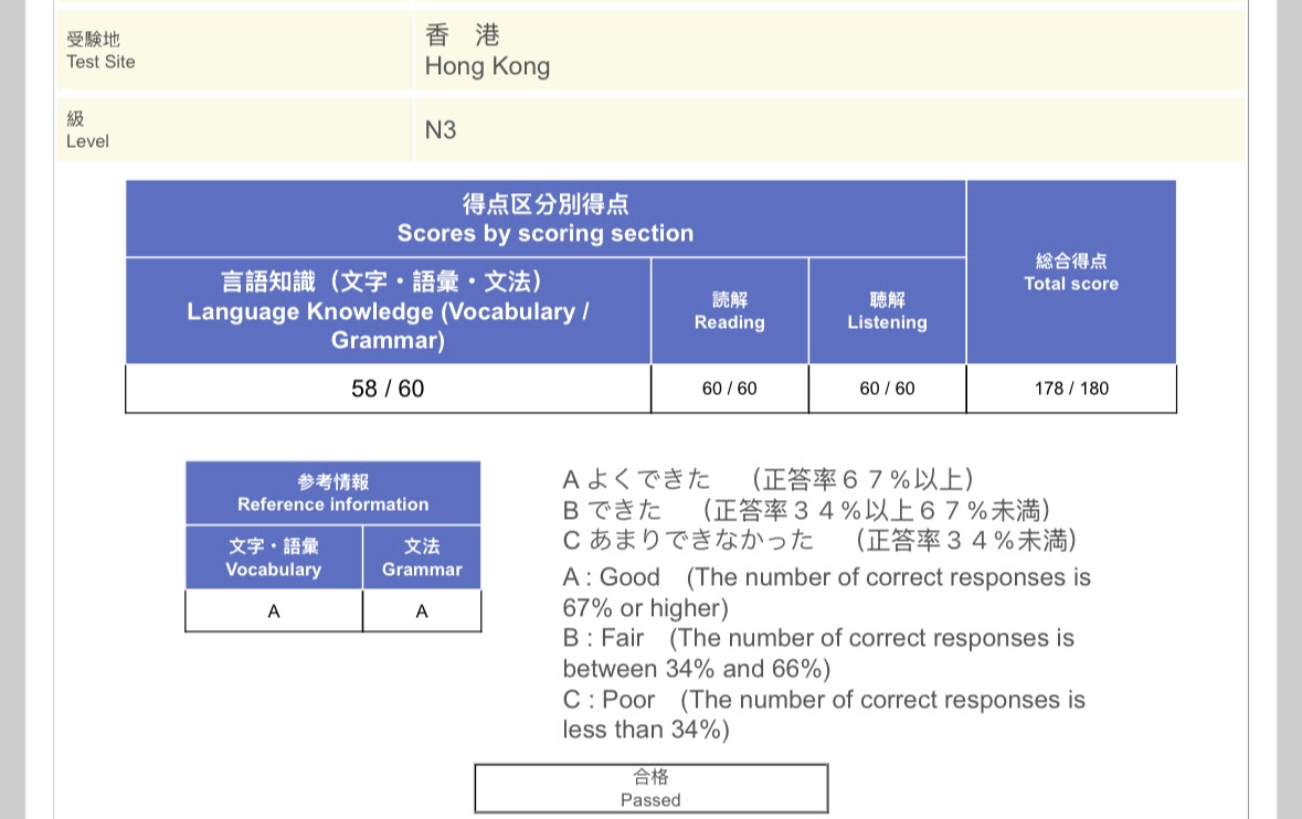 With more Japanese content consumption, I have started to feel more confident in my Japanese. And here is the result of the JLPT N3 test: